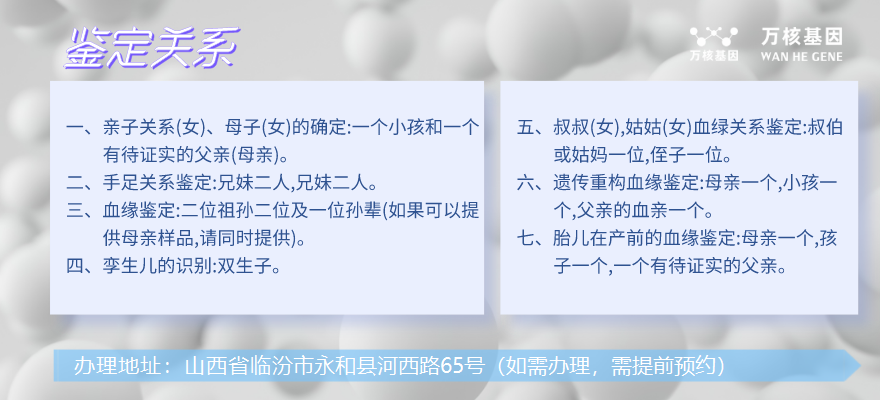 通常,當(dāng)您想要進(jìn)行孕期靜脈血胎兒親子鑒定時,與永和萬核基因聯(lián)系:電話:4001789498,討論樣本采集方式,測試步驟和費(fèi)用等相關(guān)問題,辦理地址:山西省臨汾市永和縣河西路65號(如需辦理,需提前預(yù)約)。