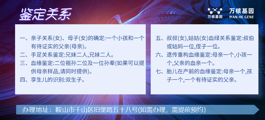 鞍山立山哪里有做親子鑒定?,立山區(qū)辦理地址:鞍山市千山區(qū)舊堡路五十八號(如需辦理,需提前預(yù)約)隨著時代的進(jìn)步,親子鑒定已經(jīng)成為了現(xiàn)代社會不可缺少的一部分。為了保障親子鑒定的準(zhǔn)確性和合法性,鞍山立山用戶需要選擇正規(guī)的親子鑒定機(jī)構(gòu)。那么,在選擇正規(guī)的親子鑒定時,我們應(yīng)該注意哪些問題呢?以下由鞍山立山萬核親子鑒定服務(wù)中心帶你了解:鞍山立山哪里有做親子鑒定?。