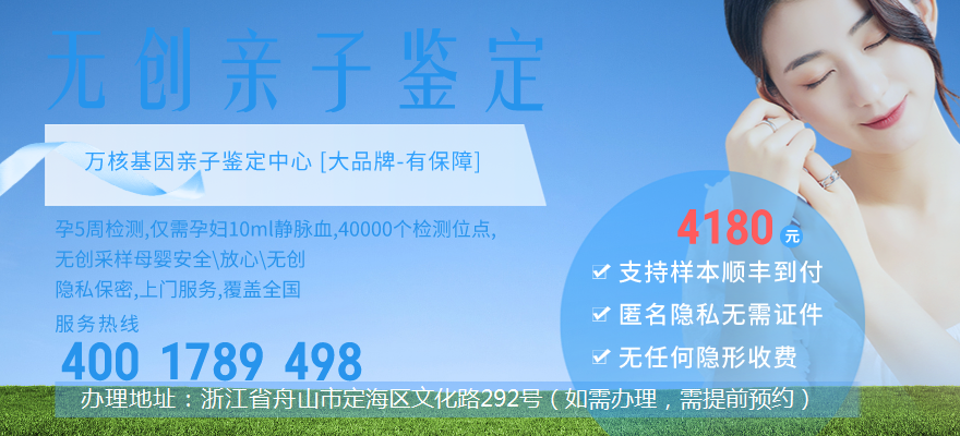 舟山定海萬(wàn)核親子鑒定咨詢服務(wù)中心,目前聯(lián)合了多家權(quán)威法醫(yī)物證司法鑒定及基因檢測(cè)公司的親子鑒定服務(wù)咨詢機(jī)構(gòu)。位于辦理地址:浙江省舟山市定海區(qū)文化路292號(hào)(如需辦理,需提前預(yù)約),聯(lián)系電話:4001789498。,在全國(guó)各地都設(shè)有親子鑒定分部受理點(diǎn)及聯(lián)系方式,常年為國(guó)內(nèi)外客戶提供專業(yè)權(quán)威的DNA親子鑒定服務(wù)。輕松辦理無(wú)創(chuàng)產(chǎn)前親子鑒定、司法親子鑒定、移民親子鑒定、入戶親子鑒定、中考報(bào)告親子鑒定、高考親子鑒定、個(gè)人隱私親子鑒定等等咨詢服務(wù)和提供專業(yè)知識(shí)及答復(fù),報(bào)告國(guó)內(nèi)外通用,正規(guī)親子鑒定機(jī)構(gòu)。