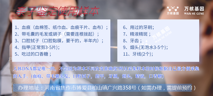 關(guān)于博愛的親子鑒定類型及收費,博愛萬核基因為您提供以下信息: