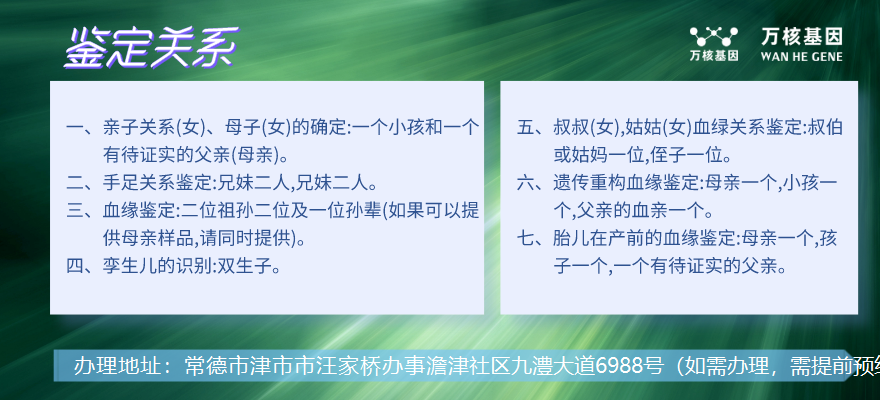 津市萬核基因在全國各地都設(shè)有親子鑒定分部受理點及聯(lián)系方式,自始至終為國內(nèi)客戶提供專業(yè)權(quán)威的DNA親子鑒定服務(wù)。您可以輕松辦理親子鑒定、個人親子鑒定、移民親子鑒定、上戶口親子鑒定、親緣親子鑒定、孕期親子鑒定(孕期五周即可檢測,安全放心,全國覆蓋)。確保您的隱私和安全。