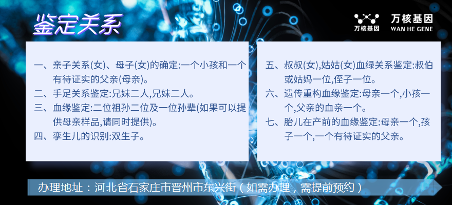 個(gè)人隱私親子檢測(cè)辦理地址:河北省石家莊市晉州市東興街(如需辦理,需提前預(yù)約),服務(wù)地址包括:長(zhǎng)安區(qū)、橋西區(qū)、新華區(qū)、井陘礦區(qū)、裕華區(qū)、藁城區(qū)、鹿泉區(qū)、欒城區(qū)、井陘縣、正定縣、行唐縣、靈壽縣、高邑縣、深澤縣、贊皇縣、無(wú)極縣、平山縣、元氏縣、趙縣、辛集市、晉州市、新樂市等晉州市周邊地區(qū),晉州市萬(wàn)核親子鑒定服務(wù)中心的服務(wù)范圍涵蓋了廣義的親子鑒定、DNA驗(yàn)證、親子鑒定證明等等。