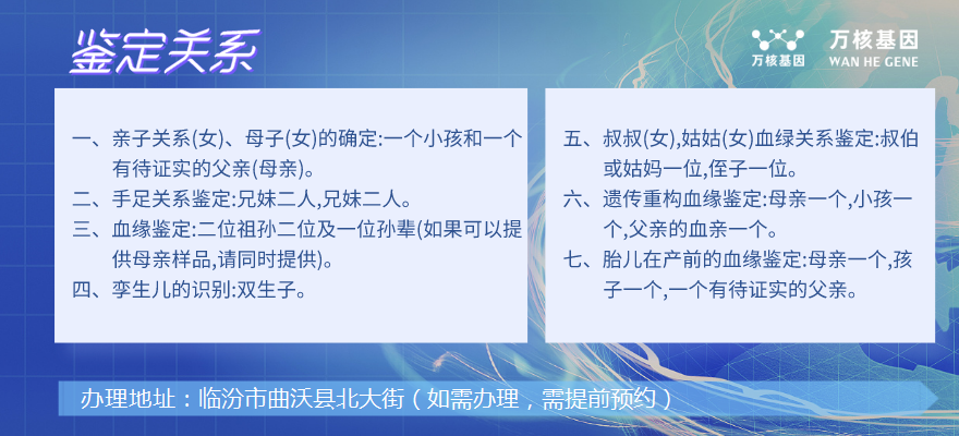 曲沃親子鑒定辦理地址:臨汾市曲沃縣北大街(如需辦理,需提前預約),萬核親子鑒定專業(yè)服務機構(gòu)是一家提供親子鑒定服務的機構(gòu),其核心業(yè)務是對父母和孩子之間的親子關(guān)系進行鑒定。