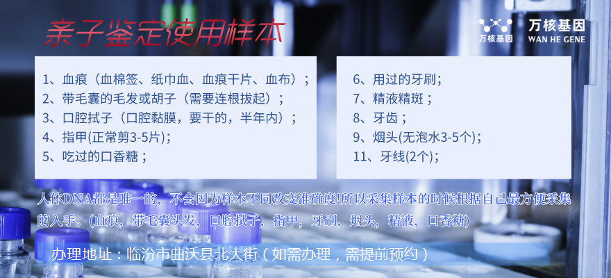 提示: 親子鑒定的樣本類型和采集時應注意的事項對于確保鑒定結(jié)果的準確性至關(guān)重要。采集時需認真按照曲沃萬核基因操作規(guī)范進行操作,保證安全和規(guī)范,才能確保鑒定結(jié)果的準確性和權(quán)威性。