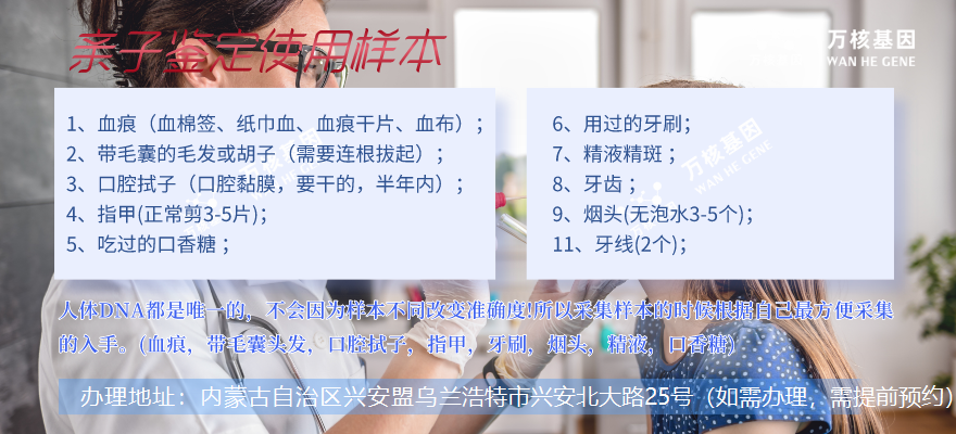 興安盟無(wú)創(chuàng)親子鑒定辦理地址:內(nèi)蒙古自治區(qū)興安盟烏蘭浩特市興安北大路25號(hào)(如需辦理,需提前預(yù)約),服務(wù)地址包括:烏蘭浩特市、阿爾山市、科爾沁右翼前旗、科爾沁右翼中旗、扎賚特旗、突泉縣等興安盟周邊地區(qū),興安盟萬(wàn)核親子鑒定服務(wù)中心的服務(wù)范圍涵蓋了廣義的親子鑒定、DNA驗(yàn)證、親子鑒定證明等等。