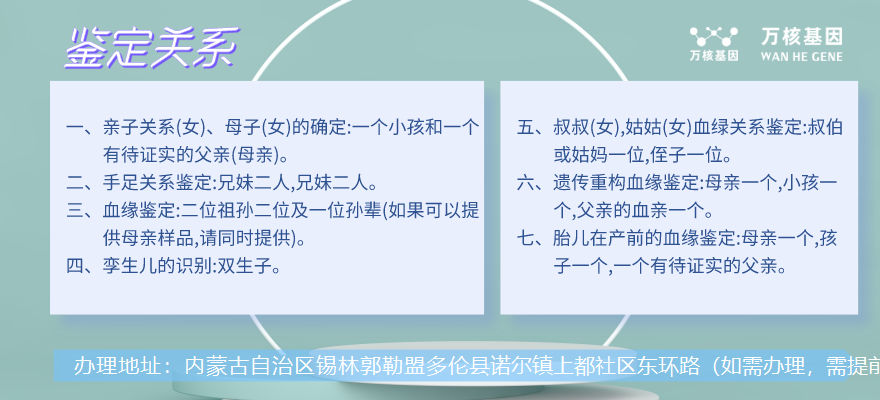 可在線咨詢:多倫胎兒孕期親子鑒定、司法親子鑒定、移民親子鑒定、入戶親子鑒定、中考報(bào)告親子鑒定、高考親子鑒定、個(gè)人隱私親子鑒定等等咨詢服務(wù),萬(wàn)核親子鑒定咨詢服務(wù)機(jī)構(gòu),聯(lián)合了多家權(quán)威法醫(yī)物證司法鑒定及基因檢測(cè)公司的親子鑒定服務(wù)咨詢機(jī)構(gòu),采用先進(jìn)的DNA檢測(cè)技術(shù),確保鑒定結(jié)果的準(zhǔn)確性和可靠性。
