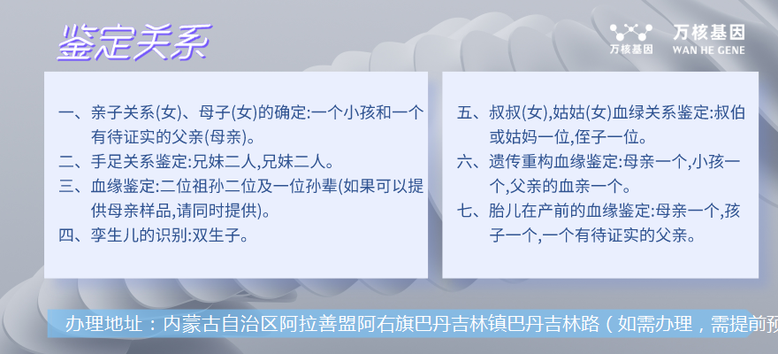 阿拉善右個(gè)人DNA親子鑒定辦理地址:內(nèi)蒙古自治區(qū)阿拉善盟阿右旗巴丹吉林鎮(zhèn)巴丹吉林路(如需辦理,需提前預(yù)約),服務(wù)地址包括:阿拉善左旗、阿拉善右旗、額濟(jì)納旗等阿拉善右旗周邊地區(qū),阿拉善右旗萬(wàn)核親子鑒定服務(wù)中心的服務(wù)范圍涵蓋了廣義的親子鑒定、DNA驗(yàn)證、親子鑒定證明等等。