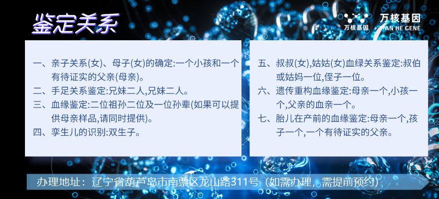 葫蘆島南票產(chǎn)前親子鑒定辦理地址:遼寧省葫蘆島市南票區(qū)龍山路311號(如需辦理,需提前預(yù)約),服務(wù)地址包括:連山區(qū)、龍港區(qū)、南票區(qū)、綏中縣、建昌縣、興城市等南票區(qū)周邊地區(qū),南票區(qū)萬核親子鑒定服務(wù)中心的服務(wù)范圍涵蓋了廣義的親子鑒定、DNA驗(yàn)證、親子鑒定證明等等。