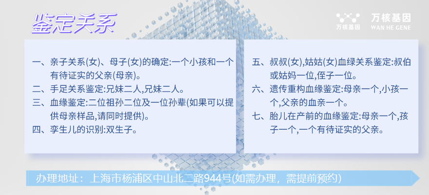 上海嘉定做親子鑒定去哪做?,上海嘉定辦理地址:上海市楊浦區(qū)中山北二路944號(hào)(如需辦理,需提前預(yù)約),咨詢(xún)電話(huà):4001789498(上海嘉定萬(wàn)核親子鑒定服務(wù)機(jī)構(gòu))