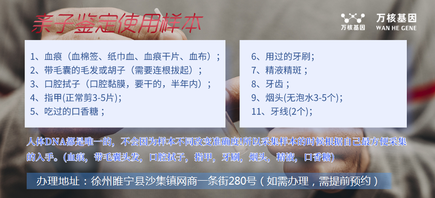 注:在采集樣本前,應(yīng)與睢寧萬核親子鑒定咨詢中心了解樣本類型及其適用性,根據(jù)需要進(jìn)行選擇,以提高親子鑒定的準(zhǔn)確性。
