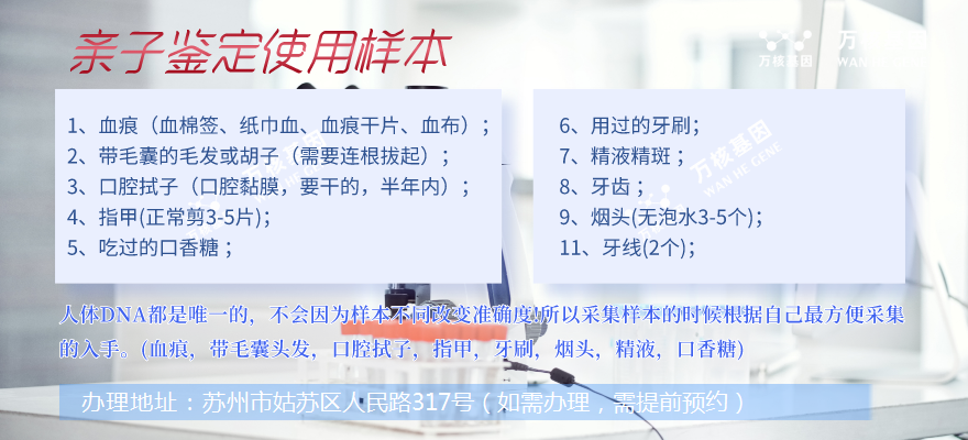 可提供多種采樣方式,并根據(jù)實(shí)際情況選擇最為合適的樣本進(jìn)行鑒定,確保鑒定結(jié)果的準(zhǔn)確性。蘇州市做個(gè)人親子鑒定需要多少錢?個(gè)人隱私親子鑒定服務(wù)價(jià)格優(yōu)惠,一般2000元起,鑒定周期為5-7個(gè)工作日,讓客戶得到及時(shí)的結(jié)果。