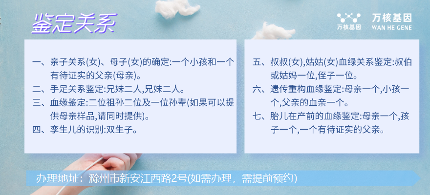 定遠(yuǎn)萬核親子鑒定咨詢服務(wù)中心,目前聯(lián)合了多家權(quán)威法醫(yī)物證司法鑒定及基因檢測公司的親子鑒定服務(wù)咨詢機(jī)構(gòu)。位于辦理地址:滁州市新安江西路2號(如需辦理,需提前預(yù)約),聯(lián)系電話:4001789498。,在全國各地都設(shè)有親子鑒定分部受理點(diǎn)及聯(lián)系方式,常年為國內(nèi)外客戶提供專業(yè)權(quán)威的DNA親子鑒定服務(wù)。輕松辦理無創(chuàng)產(chǎn)前親子鑒定、司法親子鑒定、移民親子鑒定、入戶親子鑒定、中考報告親子鑒定、高考親子鑒定、個人隱私親子鑒定等等咨詢服務(wù)和提供專業(yè)知識及答復(fù),報告國內(nèi)外通用,正規(guī)親子鑒定機(jī)構(gòu)。