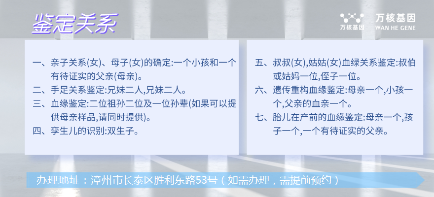 在現(xiàn)代社會(huì),親子關(guān)系的判定尤為重要。例如,父母想要確定自己的孩子是否為親生子女,或者在繼承財(cái)產(chǎn)等方面需要進(jìn)行親子關(guān)系鑒定。此時(shí),漳州長泰萬核親子鑒定服務(wù)中心提供了快捷、準(zhǔn)確和可靠的解決方案,以確保親子關(guān)系的真實(shí)性得到確認(rèn)。