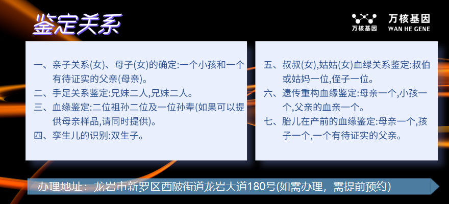 連城哪可以做親子鑒定?,鑒定親子關系在現(xiàn)代社會變得越來越普遍,因為它能夠幫助人們確認父母的身份,并保護兒童的合法權益。然而,如何選擇一家正規(guī)的親子鑒定機構是非常重要的。連城萬核親子鑒定服務中心是一家專業(yè)從事基因檢測服務的機構,提供多種親子鑒定服務,包括個人隱私親子鑒定(安全放心,保護客戶隱私,覆蓋全國)、移民親子鑒定、上戶口親子鑒定、親緣親子鑒定、孕期親子鑒定(孕5周即可檢測)報告國內(nèi)外通用,正規(guī)親子鑒定機構-連城辦理地址:龍巖市新羅區(qū)西陂街道龍巖大道180號(如需辦理,需提前預約)。