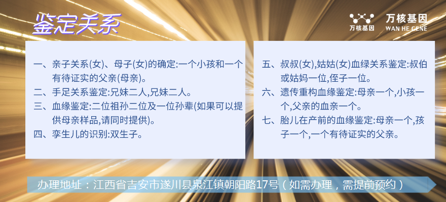 遂川個(gè)人親子鑒定機(jī)構(gòu)那里有,個(gè)人隱私親子鑒定有一個(gè)神奇特點(diǎn),那就是它能保證信息保密和親子關(guān)系可靠。讓我們想象一下,像遂川萬核親子鑒定服務(wù)機(jī)構(gòu)這樣嚴(yán)格保守秘密、透明和權(quán)威的服務(wù)機(jī)構(gòu),在全國各地都設(shè)有親子鑒定分部受理點(diǎn)及聯(lián)系方式,常年為國內(nèi)外客戶提供專業(yè)權(quán)威的DNA親子鑒定服務(wù)。