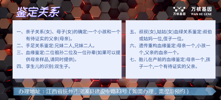 資溪萬核親子鑒定專業(yè)服務機構,為當事人給予省時省力、安全可靠的個人親子鑒定,針對個人親子鑒定能夠郵寄樣本集個人親子鑒定可以郵寄樣本檢驗,資溪萬核基因協(xié)同多所技術專業(yè)親子鑒定機構,就以世界領先的技術裝備與專業(yè)研發(fā)團隊為載體,為客戶提供高品質的親子鑒定服務項目。