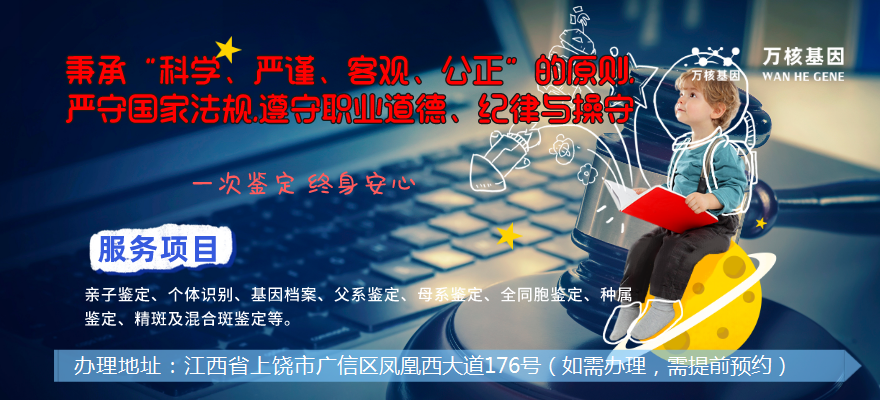 上饒廣信個人親子鑒定辦理地址:江西省上饒市廣信區(qū)鳳凰西大道176號(如需辦理,需提前預(yù)約),服務(wù)地區(qū)包括:信州區(qū)、廣豐區(qū)、廣信區(qū)、玉山縣、鉛山縣、橫峰縣、弋陽縣、余干縣、鄱陽縣、萬年縣、婺源縣、德興市等廣信區(qū)周邊地區(qū),廣信區(qū)萬核親子鑒定服務(wù)中心的服務(wù)范圍涵蓋了廣義的親子鑒定、DNA驗(yàn)證、親子鑒定證明等等。