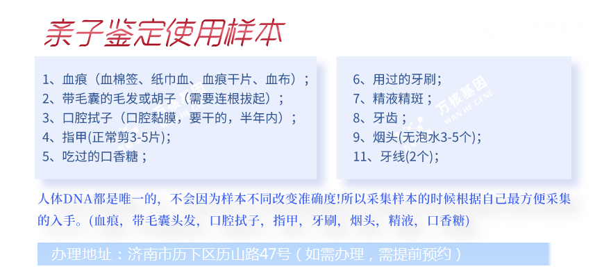 別的樣本,如毛發(fā)、手指甲、唾沫等還可以用于dna鑒定,但是其準(zhǔn)確性很容易受到一些條件的限制,如樣本品質(zhì)、儲存方法等。因而,在進(jìn)行個人親子鑒定時,應(yīng)首先選擇口腔粘膜細(xì)胞樣本或血夜樣本進(jìn)行檢驗,以獲取更高的準(zhǔn)確性。