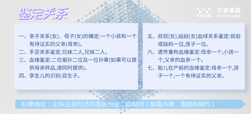 總之,無論你的需求是什么,濱州沾化萬核親子鑒定咨詢中心都能夠提供快速高效的服務(wù)。正如所說,萬核基因切實地幫助您答疑解惑,保護(hù)您的家庭幸福”。如果你正在需要親子鑒定服務(wù)。