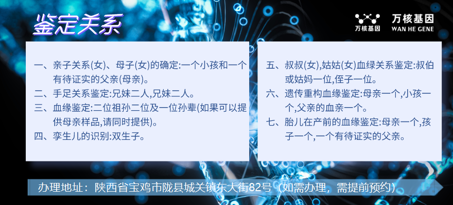 隴縣萬(wàn)核親子鑒定服務(wù)中心將是您最好的選擇。我們將竭盡全力為您提供優(yōu)質(zhì)、快速、準(zhǔn)確、保密的檢測(cè)服務(wù),讓您放心、滿意!