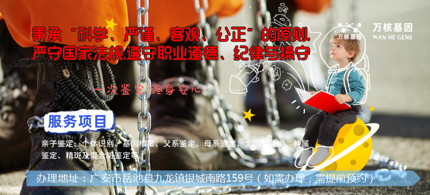 具體鑒定方案可咨詢岳池萬核親子鑒定服務機構(gòu),辦理地址:廣安市岳池縣九龍鎮(zhèn)銀城南路159號(如需辦理,需提前預約)萬核機構(gòu)以誠信為本,秉承拒絕一切“真”、“精”、“密”的原則,為廣大客戶提供精準、高效、保密的岳池個人DNA親子檢測的服務。