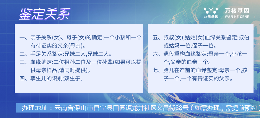 昌寧親子鑒定中心電話地址,親子鑒定是通過科學手段對父母和孩子之間的親緣關(guān)系進行檢測、驗證的一項診斷技術(shù)。親子鑒定技術(shù)的應用領域非常廣泛。下面昌寧萬核親子鑒定服務機構(gòu)將具體介紹親子鑒定親子鑒定中心電話地址:昌寧辦理地址:云南省保山市昌寧縣田園鎮(zhèn)龍井社區(qū)文昌街88號(如需辦理,需提前預約)。