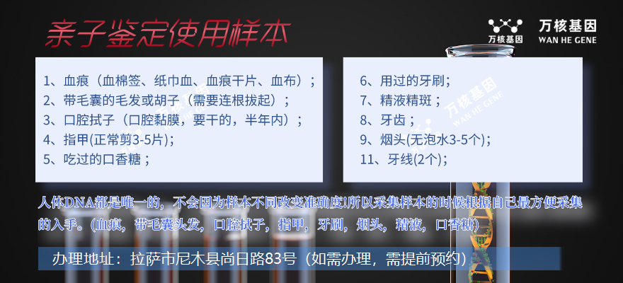 尼木萬(wàn)核親子鑒定咨詢服務(wù)中心,目前聯(lián)合了多家權(quán)威法醫(yī)物證司法鑒定及基因檢測(cè)公司的親子鑒定服務(wù)咨詢機(jī)構(gòu)。位于辦理地址:拉薩市尼木縣尚日路83號(hào)(如需辦理,需提前預(yù)約),聯(lián)系電話:4001789498。,在全國(guó)各地都設(shè)有親子鑒定分部受理點(diǎn)及聯(lián)系方式,常年為國(guó)內(nèi)外客戶提供專業(yè)權(quán)威的DNA親子鑒定服務(wù)。輕松辦理無(wú)創(chuàng)產(chǎn)前親子鑒定、司法親子鑒定、移民親子鑒定、入戶親子鑒定、中考報(bào)告親子鑒定、高考親子鑒定、個(gè)人隱私親子鑒定等等咨詢服務(wù)和提供專業(yè)知識(shí)及答復(fù),報(bào)告國(guó)內(nèi)外通用,正規(guī)親子鑒定機(jī)構(gòu)。