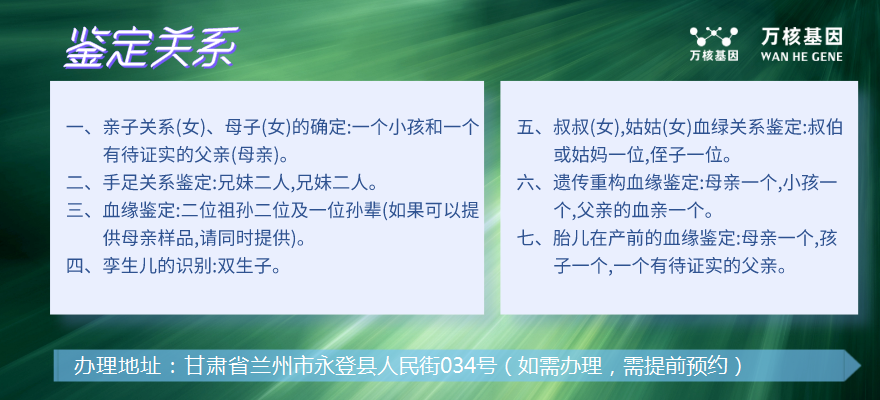 可在線咨詢:無創(chuàng)產(chǎn)前親子鑒定、司法親子鑒定、移民親子鑒定、入戶親子鑒定、中考報(bào)告親子鑒定、高考親子鑒定、永登個(gè)人dna親子鑒定等等咨詢服務(wù),萬核親子鑒定咨詢服務(wù)機(jī)構(gòu),聯(lián)合了多家權(quán)威法醫(yī)物證司法鑒定及基因檢測公司的親子鑒定服務(wù)咨詢機(jī)構(gòu),采用先進(jìn)的DNA檢測技術(shù),確保鑒定結(jié)果的準(zhǔn)確性和可靠性。