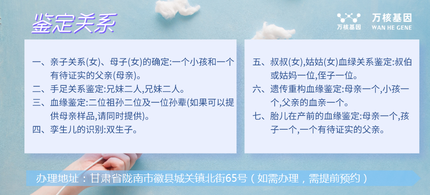個人DNA親子檢測辦理地址:甘肅省隴南市徽縣城關鎮(zhèn)北街65號(如需辦理,需提前預約)。
