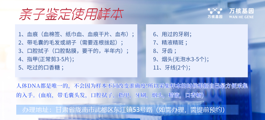 提示: 親子鑒定的樣本類型和采集時(shí)應(yīng)注意的事項(xiàng)對(duì)于確保鑒定結(jié)果的準(zhǔn)確性至關(guān)重要。采集時(shí)需認(rèn)真按照隴南市萬(wàn)核基因操作規(guī)范進(jìn)行操作,保證安全和規(guī)范,才能確保鑒定結(jié)果的準(zhǔn)確性和權(quán)威性。