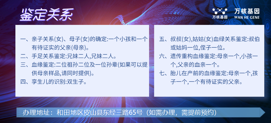 為了確定親屬關系,親子鑒定已成為一種日益普及的方法,有時甚至是必需的手段。在皮山縣,萬核親子鑒定咨詢服務機構可以為您提供全面的親子鑒定服務。無論您需要司法親子鑒定、產前親子鑒定、個人親子鑒定還是移民親子鑒定和入戶親子鑒定等,萬核親子鑒定都可以提供快速高效的辦理服務,皮山親子鑒定辦理地址:和田地區(qū)皮山縣東經三路65號(如需辦理,需提前預約)。皮山親子鑒定要注意哪些事宜?你了解能夠采集什么樣本嗎?
